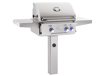 Designed for condos, apartments, or anywhere space is at a premium. The American Outdoor Grill In- Ground and Patio Post Mount units pack a lot of grilling enjoyment into smaller spaces (432 square inches). The In-Ground Grill models must be cemented into the ground. Pedestal models may be bolted to a deck or concrete slab. Both feature a backburner, warming rack and dual side shelves (standard). The optional stainless steel tank shield is designed to conceal the unsightly propane tank while a safety chain keeps the tank securely in place.